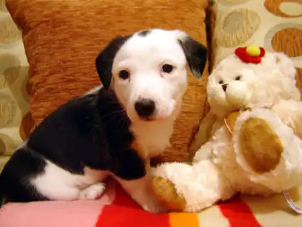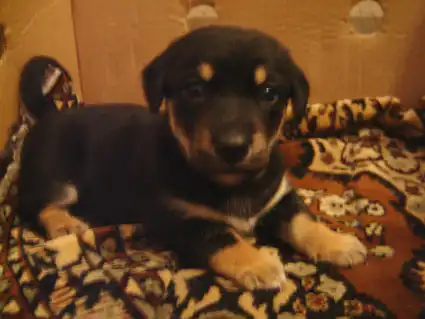 Мальчика зовем Бучей - он черно-подпалый с белым животиком - окрасом пошёл в мамку. Очень подвижный, общительный. В свои месяц и одну неделю уже громко и стрррашно рычит.