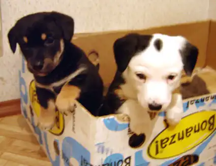 Сейчас зайчата подросли - им уже месяц. В течение следующего месяца отдадим щенят с новый дом. Когда вырастут будут не очень большого размера - подойдут как для квартиры, так и для частного дома (но на улице замерзнут - шерсть будет короткая). Станут хорошими компаньонами как для людей так и для зверей. Растут вместе с котёнком Тимошей и котом Сёмой - так что кошек знают и любят. Активные, здоровенькие, ласковые, начали кушать сами. В свои месяц и одну неделю уже громко и стрррашно рычат (((: