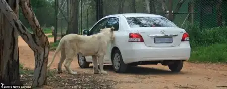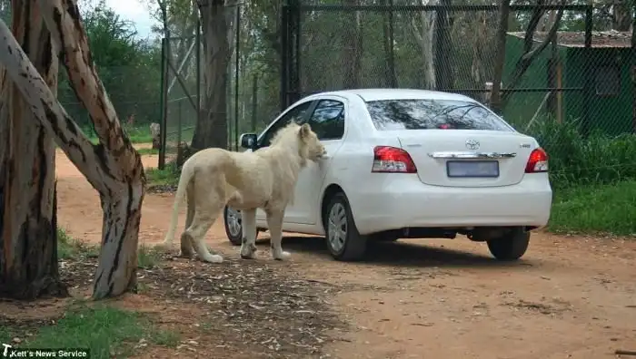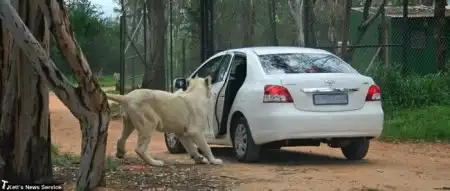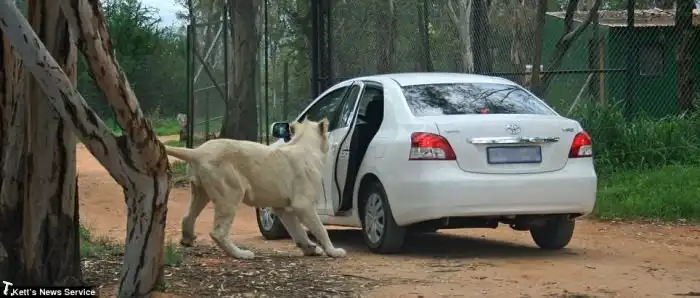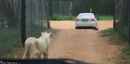 Лев преследовал автомобиль до ворот парка. А там его отпугнул охранник, кинув камень