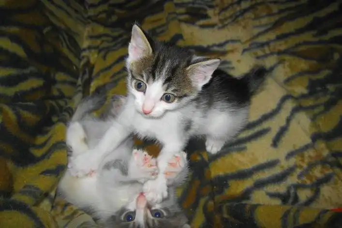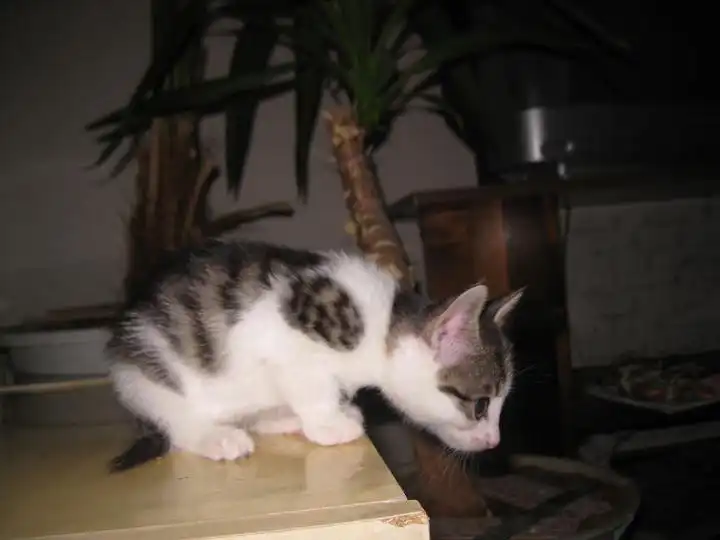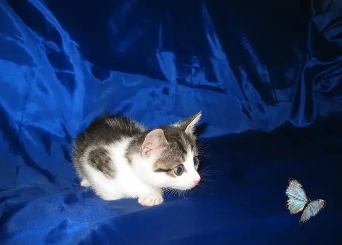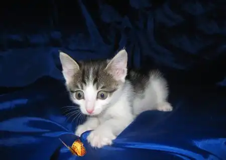 Это Пчелка, вертушка и егоза. Она мелкая, но смышленая. Первая освоила мисочку, лоточек без промахов, вездесущая глазастая непоседа.