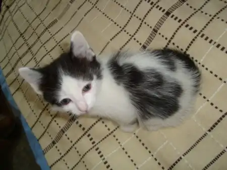 Кот: черно-белый окрас с интересным рисунком на спине, пушистый.