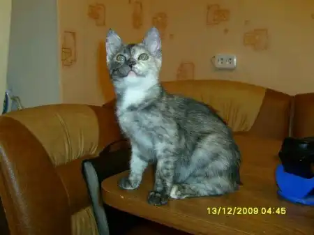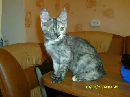 Найденная кошечка ищет дом,возраст примерно 4 - 5 мес. В еде не привередлива,к лотку приученна,блох нет. Очень любит играть. Когда её нашли,она уже практически обморозила лапки и вся дрожала,была диковата и постоянно шипела,ничего не хотела есть,но потом стала приручатьсяи и теперь совсем почти как ручная :) У неё особенный характер,она не любит когда её хватают на руки,играет сама по себе,боится,что её еду отберут и пытается защитить шипением... В то же время она сама может подойти и начать играть с вами. очень мягкая,короткошерстная киса,будет хорошей мышеловкой,активная.