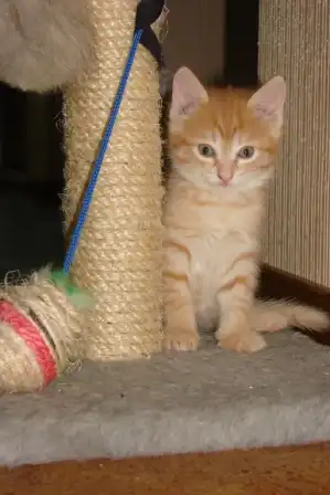 Рыжий, пушистый котик. Веселый, любит играть,ласковый.К лотку приучен, корм кушает и сухой и жидкий. День рождения 20.10.2009г.