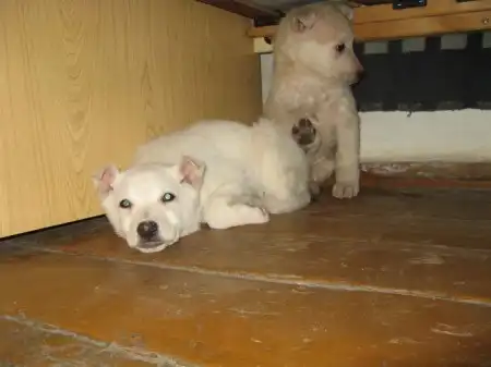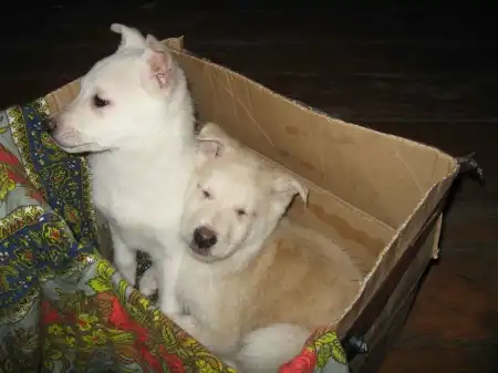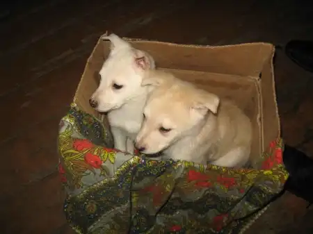 Мальчик более темный и девочка белая,возраст примерно 2 - 3 мес. на фото их мама которая тоже ищет новый дом... возраст примерно 1 - 1.5 года. Бездомная Собака ощенилась в сарае моих знакомых,те стали их кормить и взяли в дом на передержку... щенки очень дружелюбные,как и их мама в еде не привередливы. Будут хорошими друзьями и охранниками для вас и вашего дома! Очень вас ждут :)