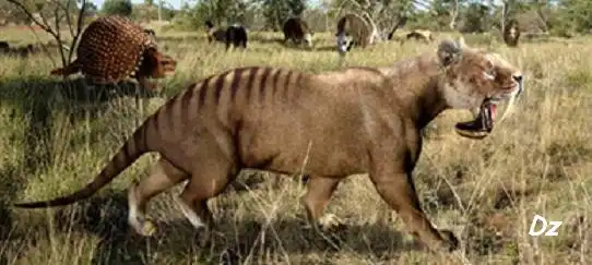 Сумчатый саблезубый тигр, или тилакосмил (Thylacosmilus) - сумчатое животное обитавшее в миоцене на территории Южной Америки. Саблезубые тигры до сих пор являются главной страшилкой в детских книжках и фильмах про доисторические времена. И действительно, сложно не бояться клыков длиной по 18 сантиметров, принадлежащих мощному четырехсоткилограммовому хищнику. Тилакосмил достигал размеров ягуара, имел длинное тело, мощные ноги и мощную, длинную шею. Верхние клыки постоянно растущие, с огромными корнями, продолжающимися в лобную область. Не смотря на всю внешнюю похожесть, тилакосмил не является родственником саблезубых тигров из семейства кошачьих.