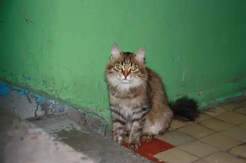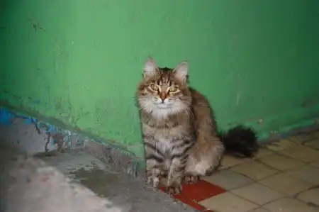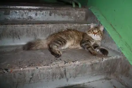 В подъезд выбросили кошечку, уже живет там около недели. Чистая, пушистая, ласковая, на вид не старше года.