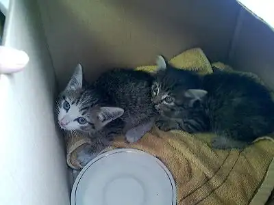 Если я не ошибаюсь, это два котика, возраст определить не могу, но глазки уже открыты и молочко лакают сами.