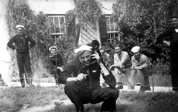 Американский моряк фотографируется с обезьянкой на Бермудах во время Второй мировой. (AP)
