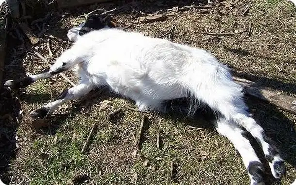Коза падает либо на спину либо вбок, конечности у нее как правило оказываются вытянутыми.