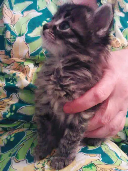 Возраст котят около 2 месяцев, 2 мальчика (серый, очень пушистый и бело-серый) и 1 девочка (бело-серенькая).