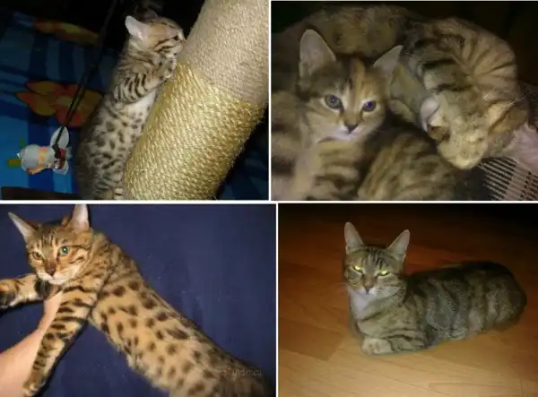 На фото: сверху сравнение бенгальского котенка (слева) и моего (справа), внизу сравнение взрослой кошки (моя справа).