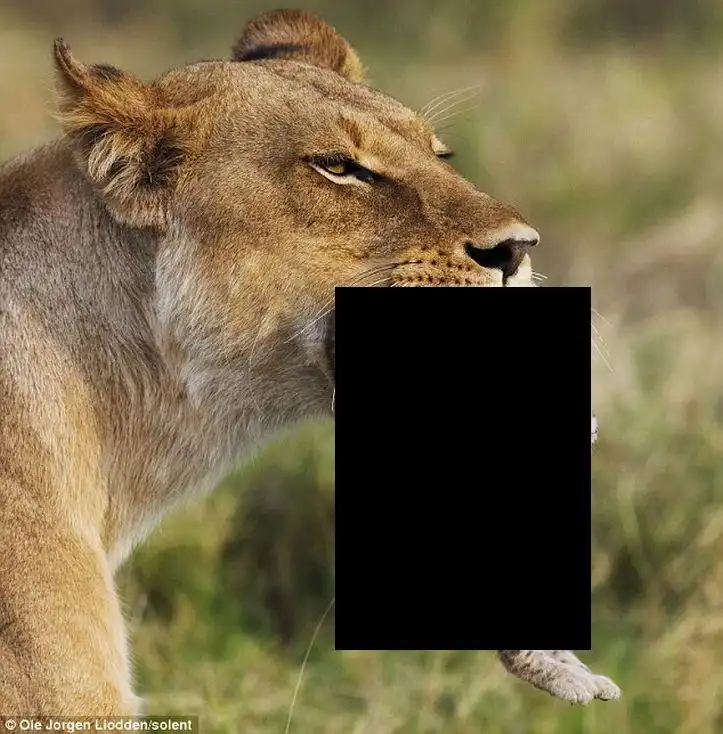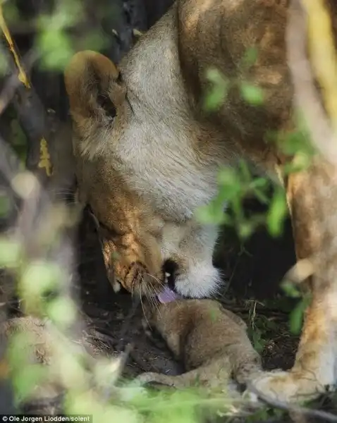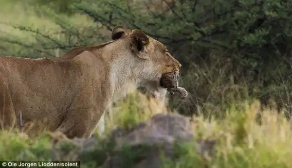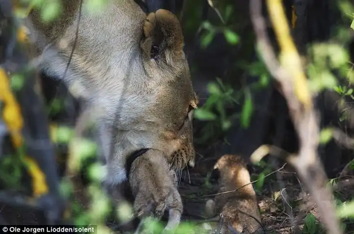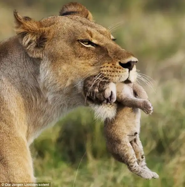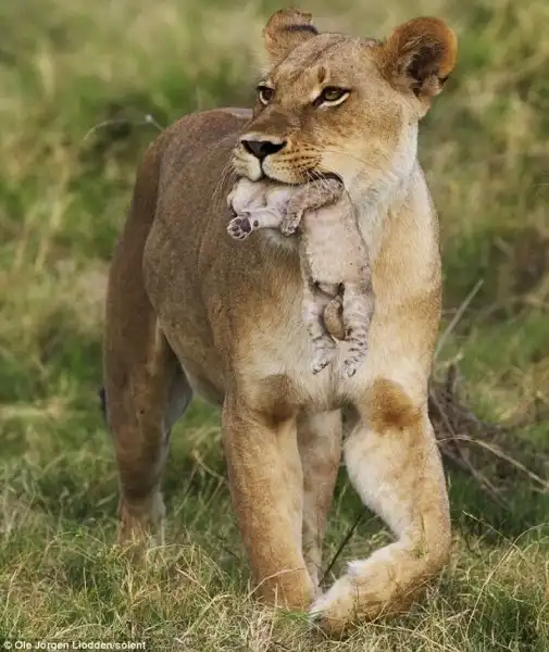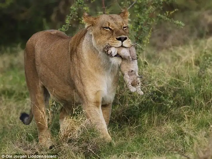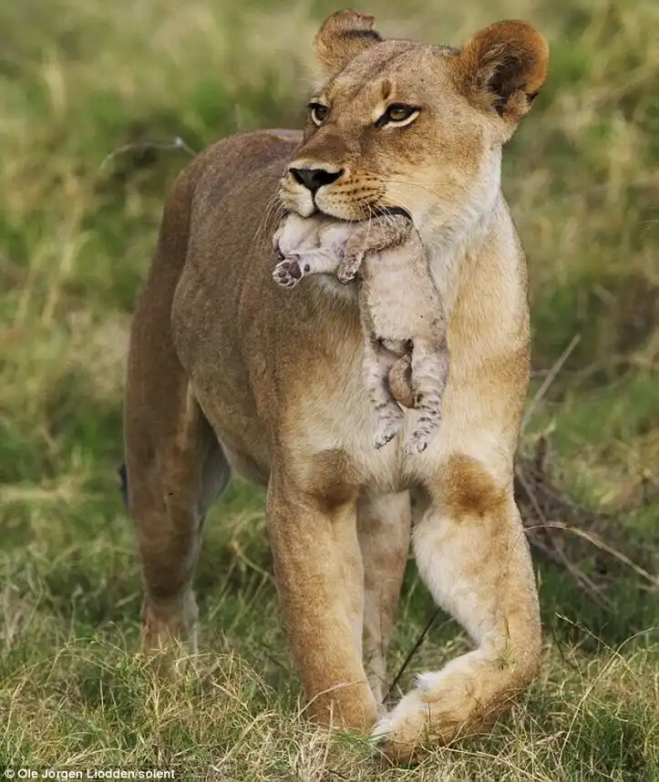 Львица несёт своего детёнышка в укрытие, после атаки буйвола.