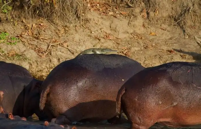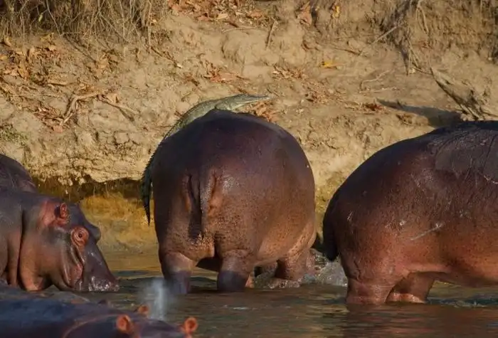 Крокодил решил перебраться на другую сторону реки, вот только способ у него не самый безопасный, он это сделал на спине бегемота. Случай этот был зафиксирован в Танзании.