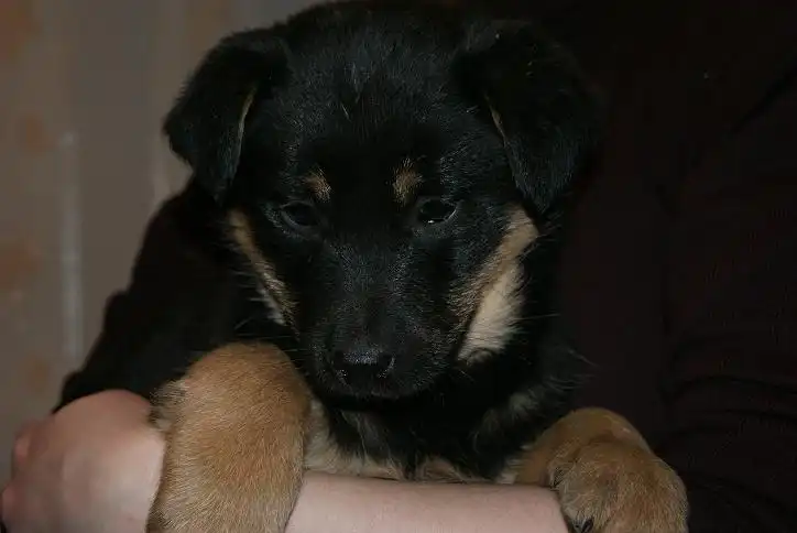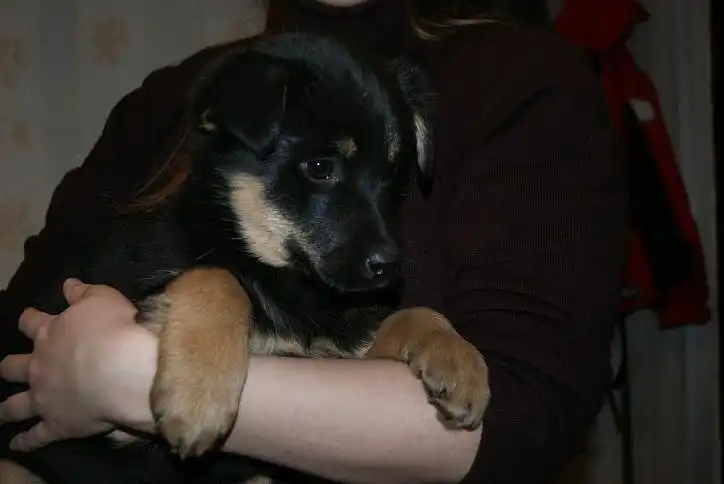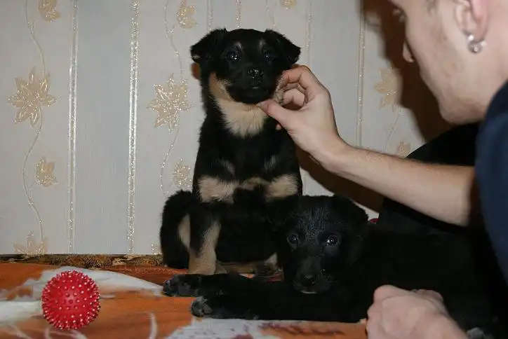 Подобрали малышку, сами того не ожидая. Не смогли устоять перед очень приятным характером девочки: очень контактная, ориентирована на человека и очень смелая(защищала братика от более крупной собаки) Ей около 2ух месяцев. Будет скорее всего средней собакой.