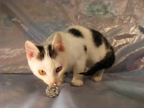Пух родился весёленьким, но ослабленным. Постоянный авитаминоз у мамы кошки, сказался на здоровье. У малыша было кожное заболевание, которое вылечили, а глазки – в процессе исцеления.