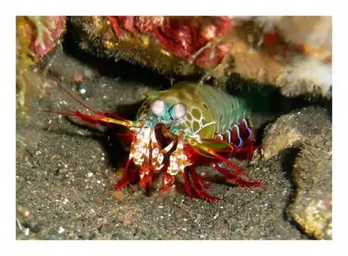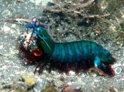 Самцы креветки-богомола обладают очень яркой внешностью. В глазах рябит от такого многообразия красок. Кроме того, эти креветки имеют уникальное зрение, которое позволяет им видеть предметы практически во всех диапазонах спектра. И еще, у них самое сложное строение глаз среди всех животных нашей планеты.