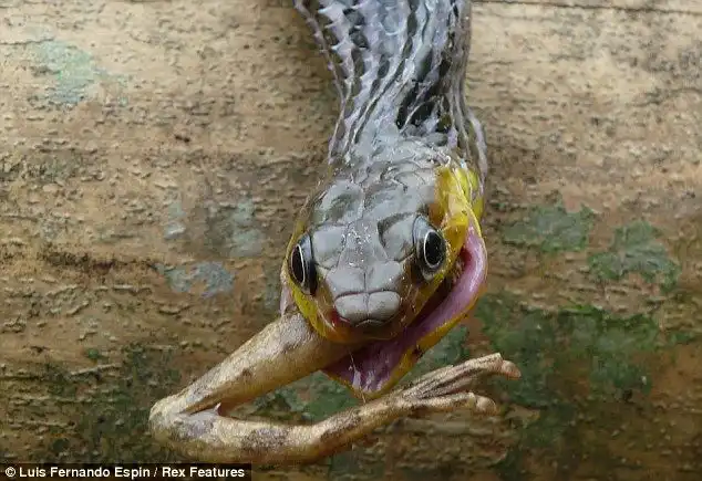 5 фотографий на самом деле повествуют о 45-и минутах отчаянной борьбы лягушки и змеи. Упираясь всеми лапами, она не смогла избежать печального конца.