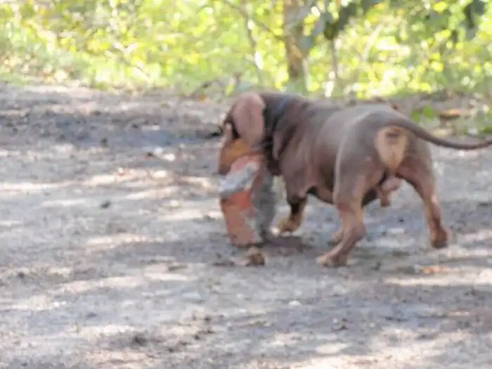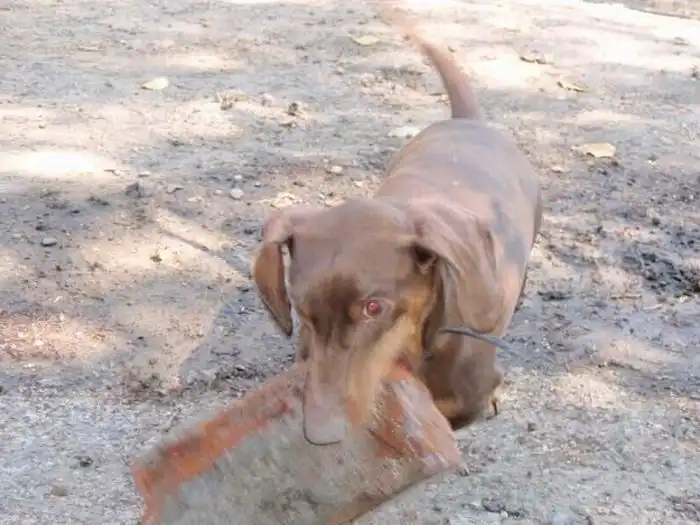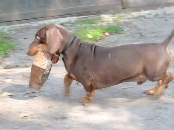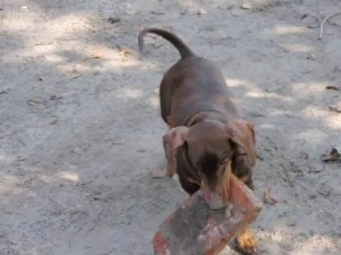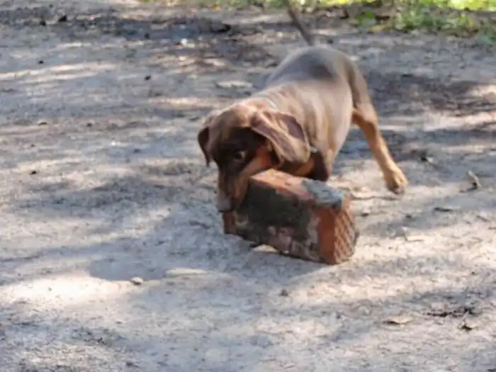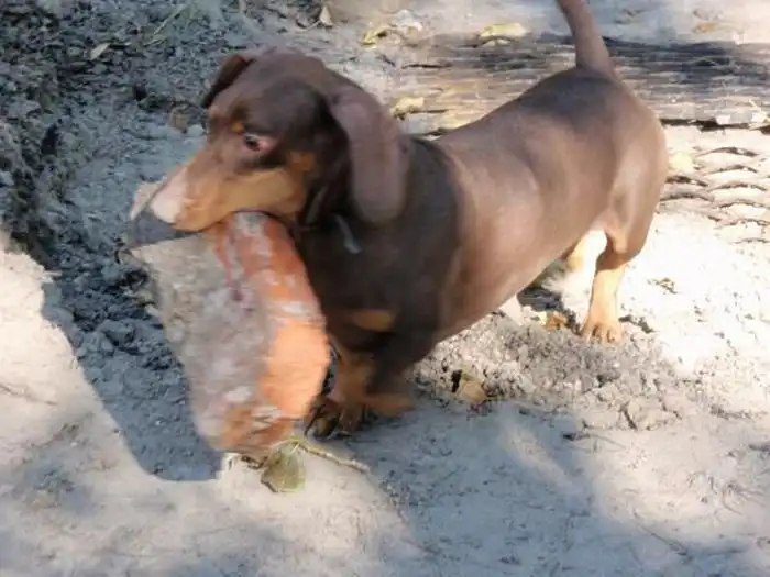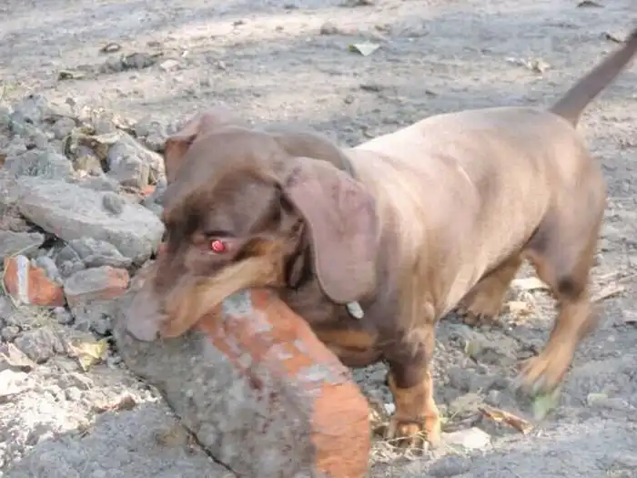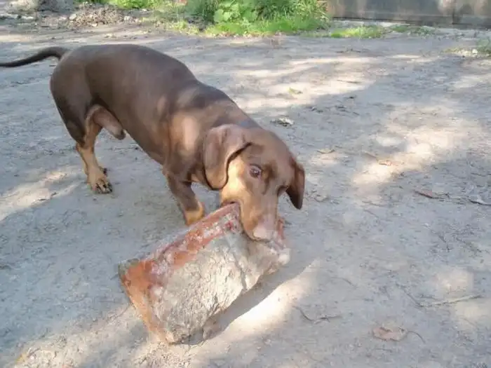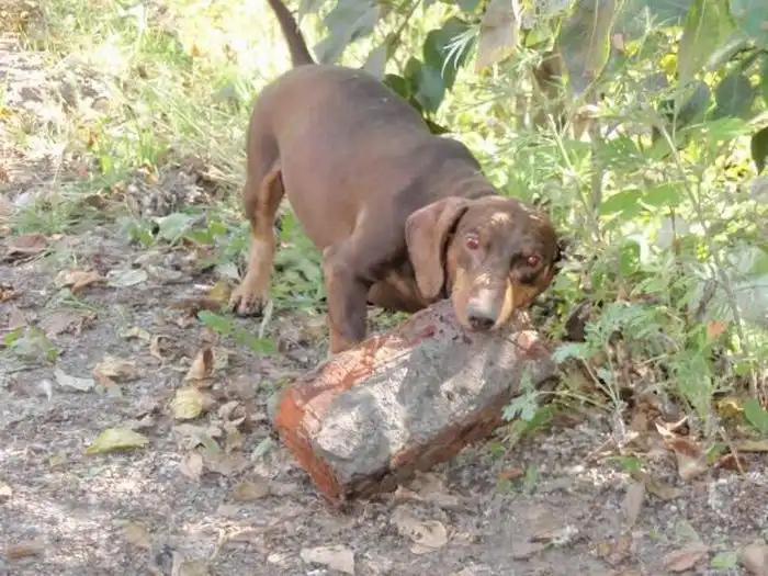 Никогда не видел, чтобы собаки игрались с кирпичами, а эта такса, видимо и не подозревает, что существуют мягкие игрушки или что-то в этом роде.