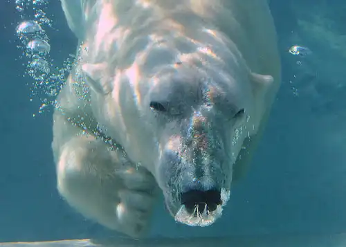 На передних лапах белого медведя между пальцами расположены перепонки, позволяющие зверю проплывать довольно большие расстояния. Известны случаи, когда белые медведи в поисках пищи преодолевали свыше полусотни километров, при этом постоянно находясь в ледяной воде. Причем плыть они могут с огромной для их массы скоростью — примерно 12 километров в час. Но обычно эти хищники предпочитают другой способ перемещения — на отколовшихся от припая льдинах.