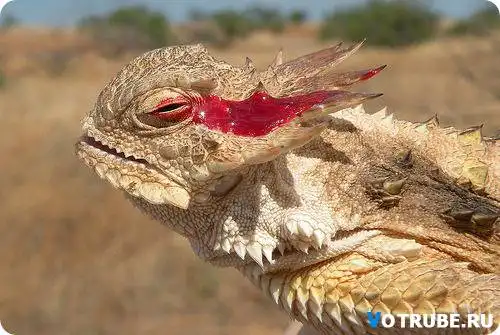 И у них есть одна необычная особенность… Они стреляют кровью из глаз… Механизм следующий: Яремная внутренняя вена сжимается особым мускулом, и кровь под большим давлением рвёт стенки сосуда в участке между глазным яблоком и стенкой глазницы, вырываясь наружу на расстояние до полутора метра. Ящерица целится в глаза хищника.