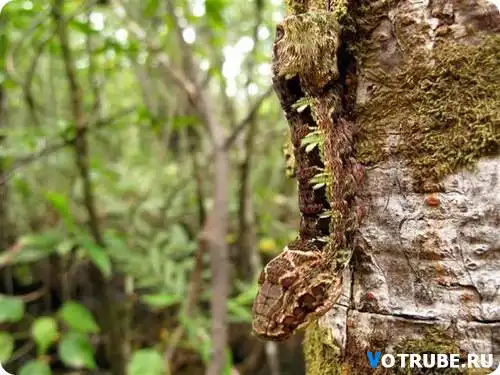Вцепившись задними лапками в дерево, она поднимает переднюю часть тела и изгибается подобно готовящейся к броску ядовитой змее. Треугольная голова, свирепые глаза и блестящая чешуя — все это создает достаточно угрожающий вид, который частенько отпугивает потенциальных врагов гусеницы (в том числе и человека).