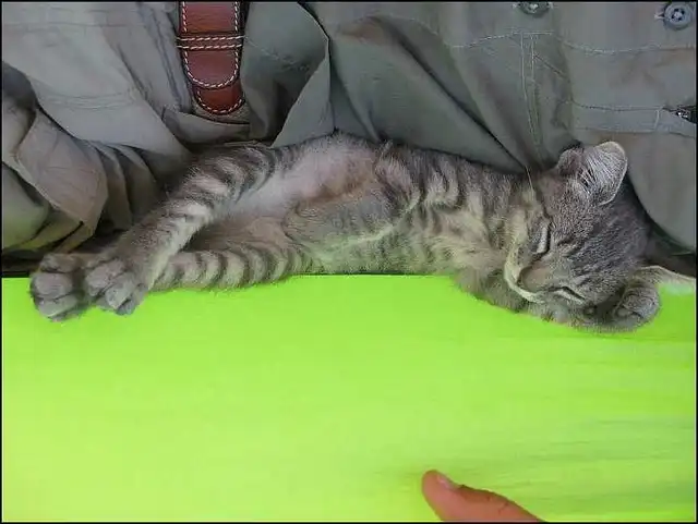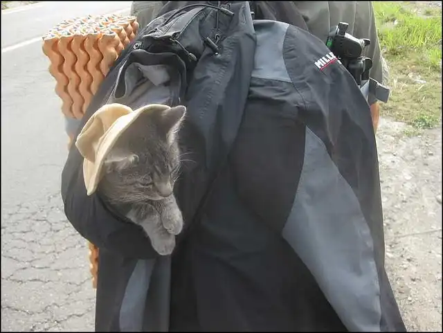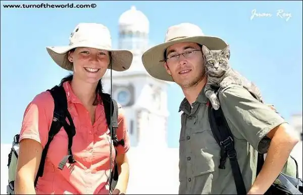 Компанию путешественникам-авантюристам составляет их кошечка Китти, которая была случайно найдена парой на обочине шумной дороги в штате Луизиана. Она была такая крошечная и одинокая, что парочка решила помочь ей отыскать новый дом. Однако в скором времени мужчина и женщина так привязались к милому созданию, что решили оставить ее себе. Китти отвели к ветеринару, где проверили ее физическое состояние и сделали все необходимые прививки, так что малышка может продолжать путь без угрозы для здоровья. Поскольку французам по их визе разрешено находиться на территории США не более 85 дней, для достижения цели им приходится проходить порядка 30 километров в день. Кошечку Китти такое положение дел ничуть не смущает. Она любит путешествия не меньше, чем ее хозяева. Она часто залазит на плечо своего папочки, чтобы насладиться каким-нибудь новым пейзажем и без смущения знакомится с новыми людьми. Вероятно, Китти станет первой кошкой увидевшей почти половину земного шара.