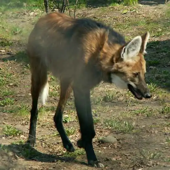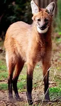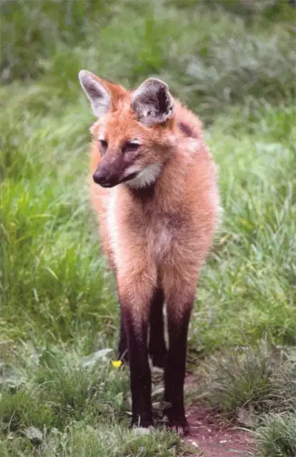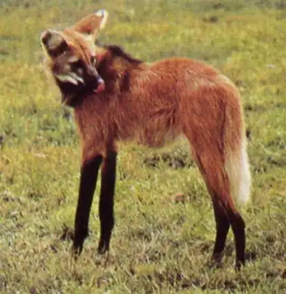 Это Бразильский гривастый волк. Самый крупный представитель семейства псовых в Южной Америке, гривастый волк обладает уникальной внешностью. Он, скорее, похож на крупную лисицу на высоких, стройных ногах, чем на «волка». Тело у него довольно короткое, ноги очень высокие.
