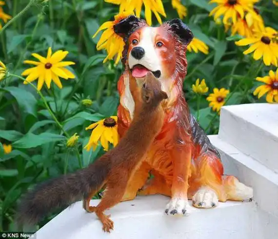 Очень смешно было фотографу по его словам наблюдать за вращениями и прыжками шаловливой белки вокруг неживой собаки – она то обвивалась вокруг статуи, демонстрируя тем самым свои акробатические способности, то поднималась на задние лапы, пытаясь дотянуться до морды и разглядеть собаку.