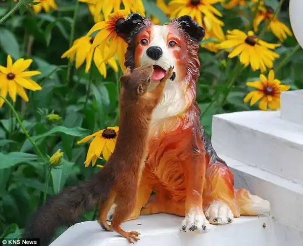 Немного покрутившись возле красивой, но какой-то странной собаки, и увлекшись ей, думая, что это все-таки настоящее животное, пушистый зверек поцеловал ее, доставая орех из пасти пса.