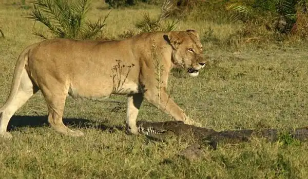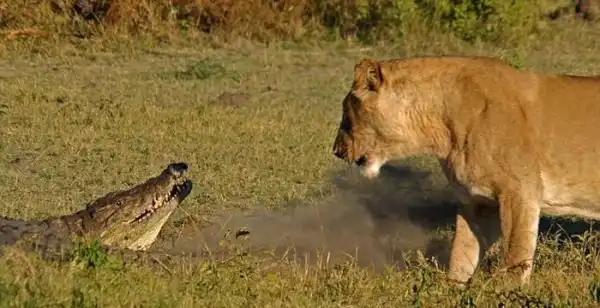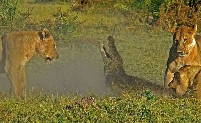 Борьба крокодила с тремя львицами