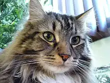 Мейн-кун (другое название - Мейнская енотовая кошка) — самая большая кошка в мире - взрослые коты достигают веса в 10 кг и размером и внешним видом (характерные кисточки на ушах и "тигриная поступь" ) напоминают небольшую рысь или камышевого кота - однако в отличие от своих хищных родственников очень дружелюбны. Мейн кун очень выносливая и активная кошка, прекрасно ладит с детьми, но застенчива и деликатна. У нее хороший характер, и за ней легко ухаживать. Она любит играть и выполнять различные трюки, у нее приятный, тихий, щебечущий голос, причем вы никогда не найдете двух мейн кунов с одинаковыми голосами. Обладательница характерной внешности, мен кун— почти короткошерстная спереди и длинношерстная на спине и брюхе. Привычная к суровому климату и нелегкой жизни, Мейн кун любит спать в странных позах и в своеобразных местах. Одинаково приспособленная к жизни в помещении и на улице, эта кошка предпочитает иметь достаточно места для прогулок.