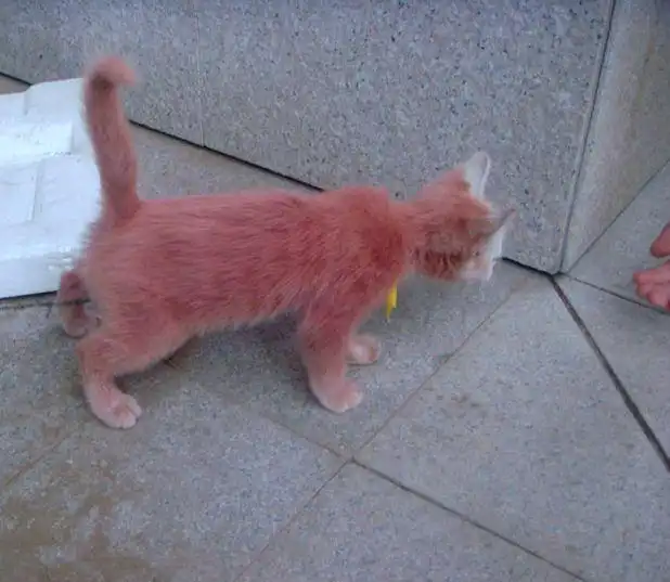 Да, это бездомная кошка. Да, она розовая. Нет, мы не знаем, почему. Йао Сьенхай из Ладжоу, провинция Гансу в Западном Китае, рассказывает, что не поверил собственным глазам, увидев животное. «Я сначала решил, что у меня что-то со зрением, но потом понял – нет, кошка действительно розовая», рассказывает он.