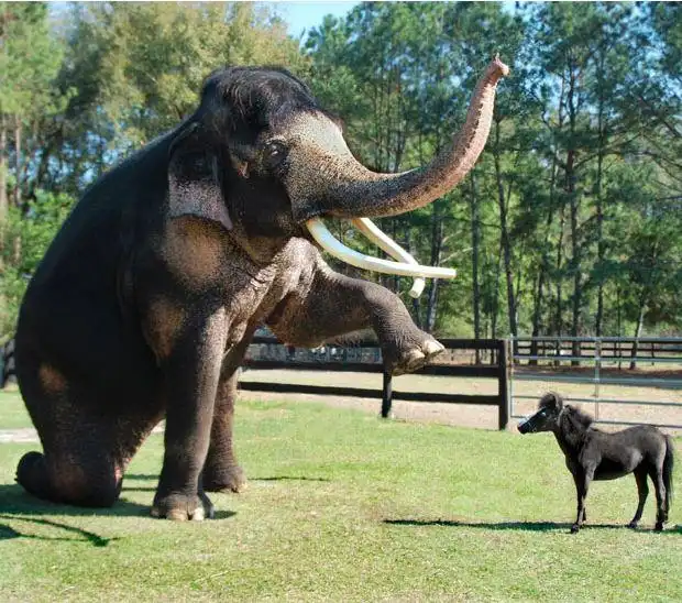 Карликовая лошадка девятнадцать дюймов (0,48 метра) в высоту рядом со слоном в Гэйнсвилле, Флорида. Дебби и Джордж Гарсия-Бенгочи из Гэйнсвилля во Флориде являются владельцами клиники «Gentle Carousel», которая проводит реабилитацию детей с помощью вот таких крошечных лошадок.