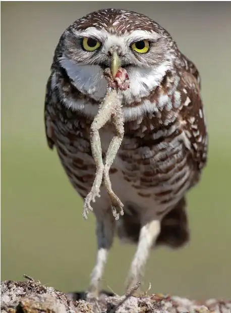 Пара лапок – вот и все, что осталось от лягушки, попавшейся кроличьей сове. Эта фотография была сделана на мысе Корал, Флорида, фотографом Меган Лоренц. Она рассказывает: «Эта фотография была сделана в конце марта. Это прекрасное время, когда животные начинают обустраивать гнезда и готовятся к появлению потомства. Эта фотография была сделана поздним утром, сова поймала лягушку, съела свою порцию и отправилась восвояси, прихватив с собой лягушачьи лапки – не иначе как в качестве подарки подруге жизни».