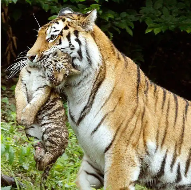Амурская тигрица Елена несет одного из своих детенышей в зоопарке Цюриха, Швейцария.