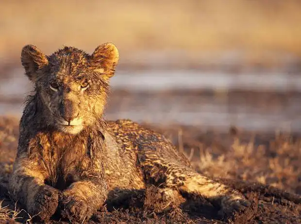 А вот и еще один львенок, невероятно грязный. Долго ему предстоит вылизываться!