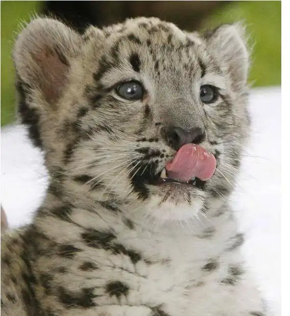 Фала, одна из двух детенышей снежного барса, в зоопарке Варшавы, Польша. Мать отказалась от малышей вскоре после их рождения в мае, и их выкармливали работники зоопарка.