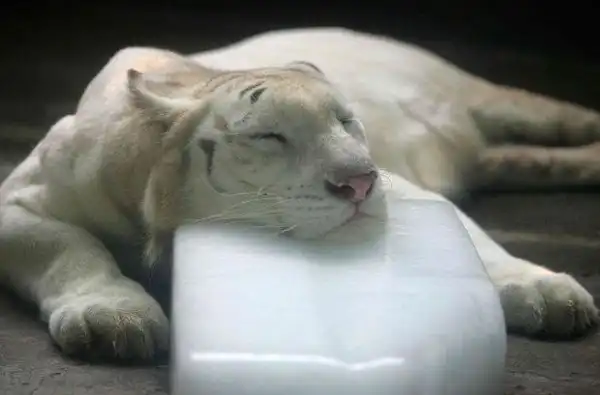 Белый бенгальский тигр отдыхает на глыбе льда в зоопарке Ченгду в Китае.
