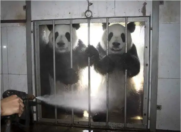 Работник зоопарка брызгает водой на двух панд в зоопарке Вейхай в провинции Шангдонг в восточном Китае.