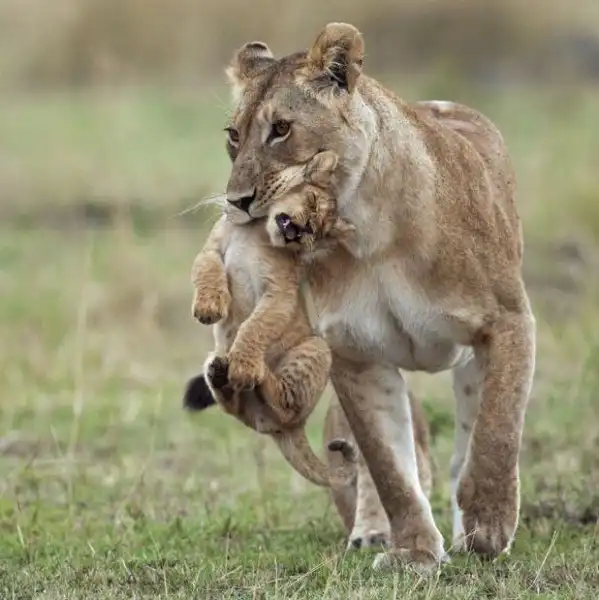 Фотографии дикой природы Ануп Шах сфотографировал львицу, несущую в зубах детеныша, в заповеднике Масаи Маара в Кении.