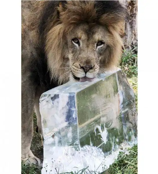 Зенда, пятилетний африканский лев, не отходит от огромной глыбы льда, которую разместили в его вольере в зоопарке Брукфильда, Иллинойс. Только так люди в состоянии помочь животному переносить жару.