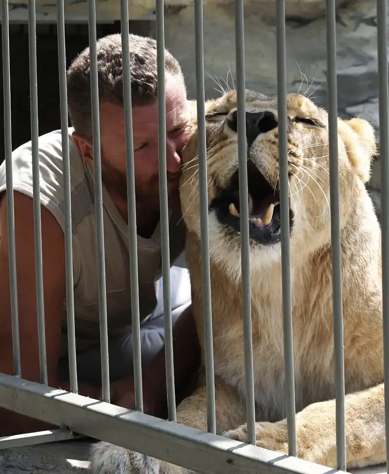 Львица Катя раньше рожала потомство. Александр рассказал местной газете, что после ее последних родов она не позволила льву Самсону быть рядом с ней, но не приветствовал нахождение рядом хозяина зоопарк.