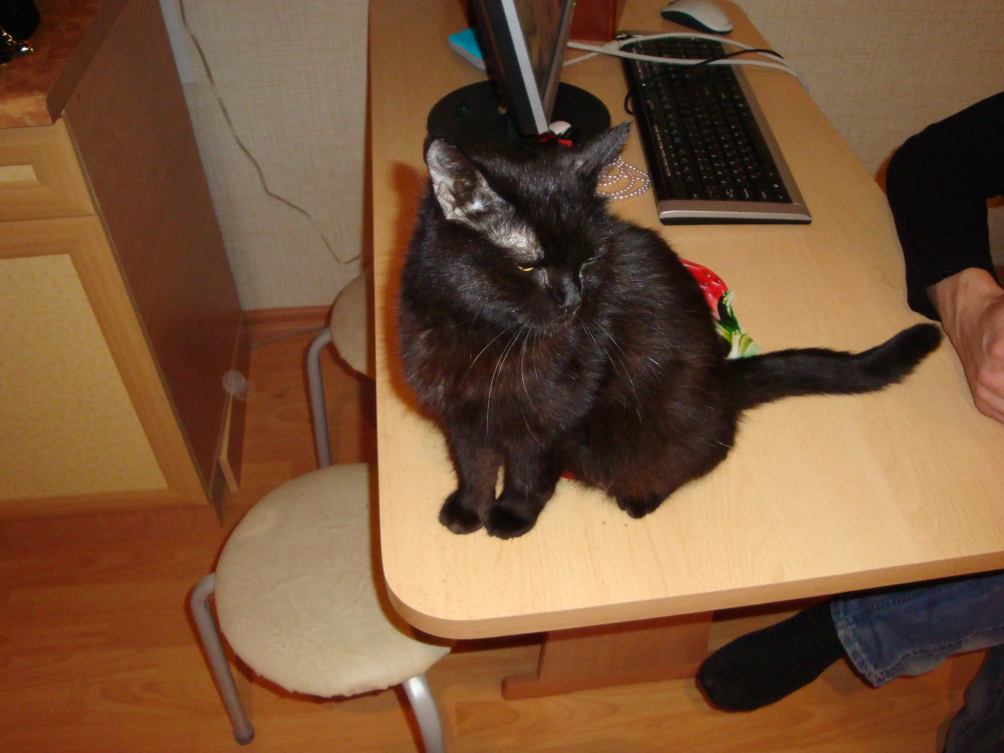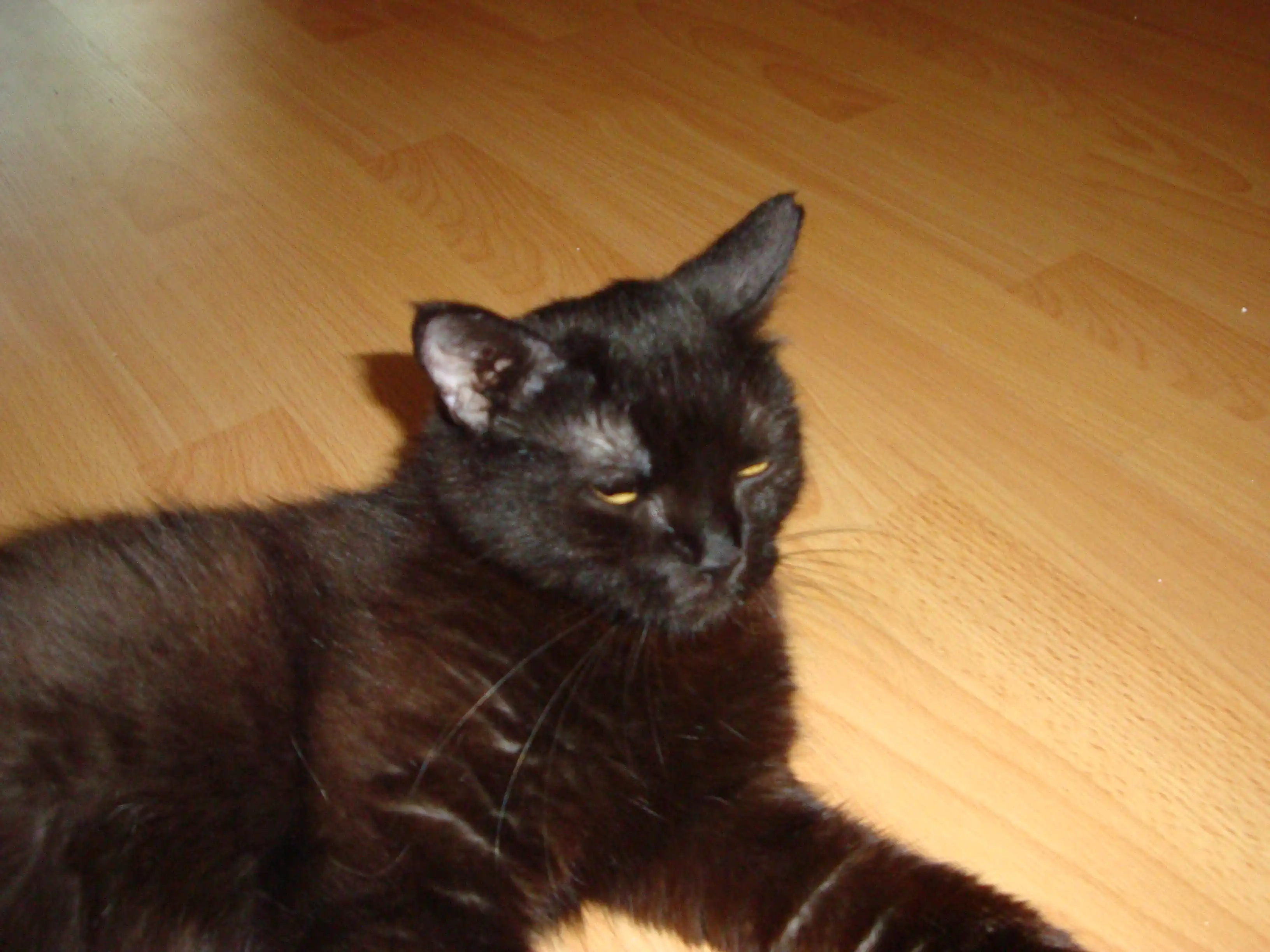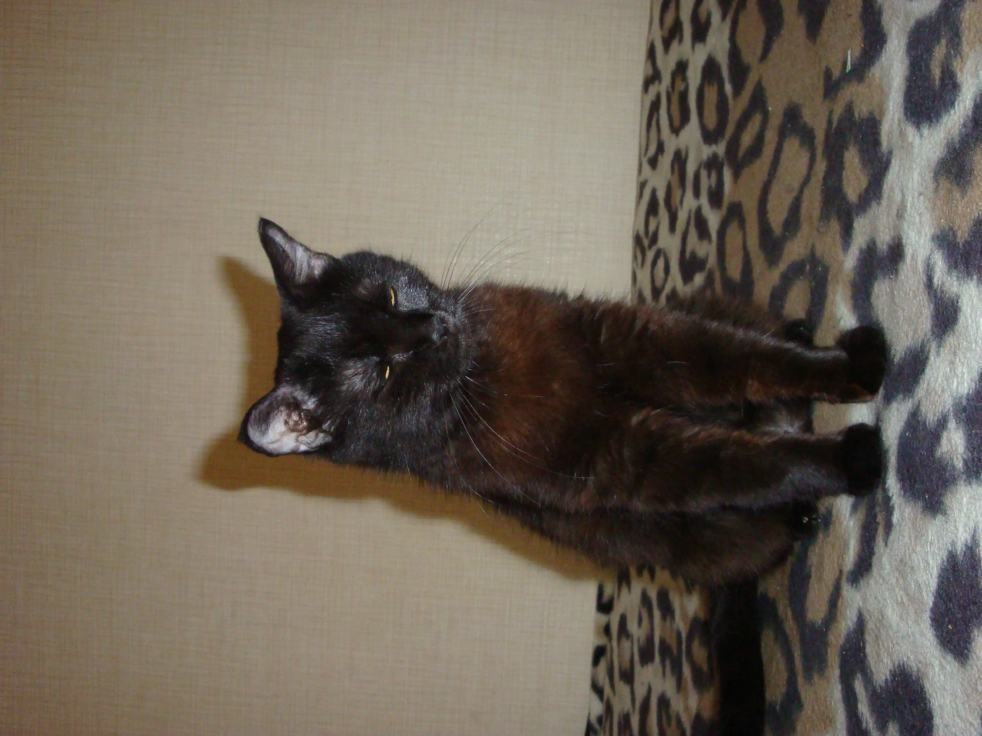 Окрас полностью черная (на левом ухе нет маленького кусочка, незаметно, но все равно примета), шерсть короткая