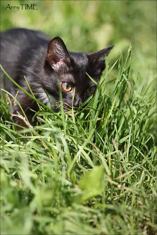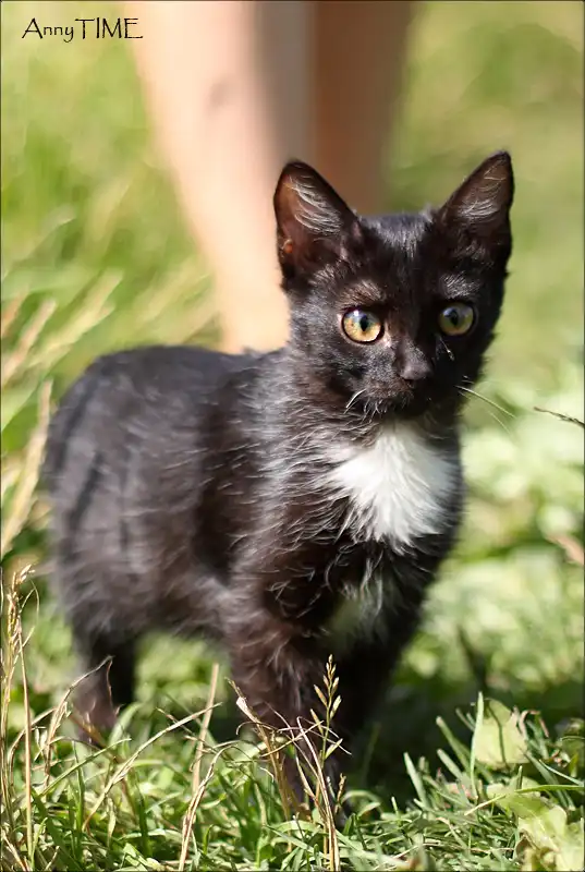 Гладкошерстная чёрная красавица с белым бантом, брюшком, плавочками и лапками. Она гуляет сама по себе. Человека она признаёт лишь постольку, поскольку её кормят (и то кусок она всегда старается урвать у соседа-соседки), идеальная ловчиха. Но мы её приучаем к ласке и стараемся развивать в ней понимание отношений... И в последнее время она стала приходить помурчать, погладиться, полежать рядом. Но вообще ей особенно никто, похоже, не нужен для души.По крайней мере пока. Ест она прекрасно, туалет знает.