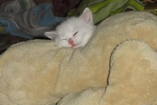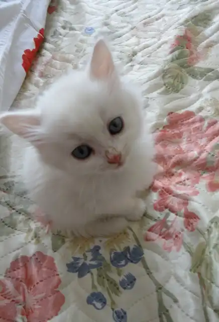 На улице был найден белый котенок, на вид примерно 1-2 месяца, чистый, игривый и ласковый. К лотку приучен.