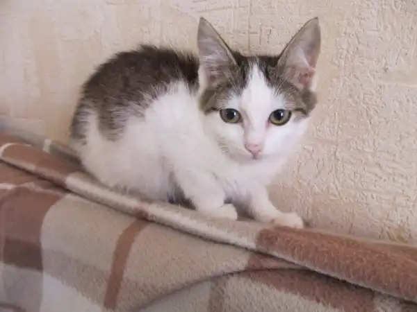 Белые котенок с коричнево-полосатыми пятнами на спине. Возраст3мес. Проглистована, блохи выведены, пролечена после тяжелой уличной жизни. Котенок нуждается в ласке, тк сначала была дикая, но ласка и любовь возвращают котенка к нормальной жизни. Любит поспать подольше под одеялом вместе с хозяином. Приучена к лотку, кушает сухой корм. 8-923-429-12-64