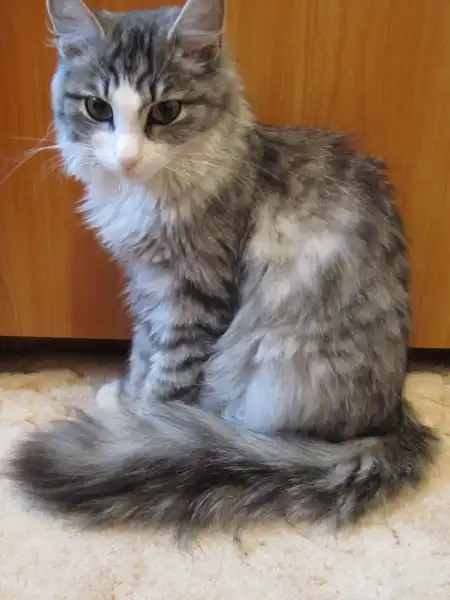 Серая кошечка пушистая. Зовут Ася.Молодая.К лотку приучена, питается сухим кормом.Гордая и воспитанная кошечка, очень ласковая, воспитанная. 8-923-429-12-64.