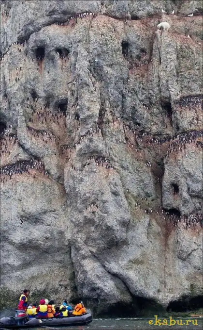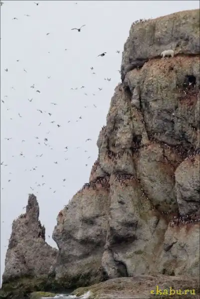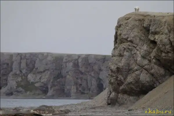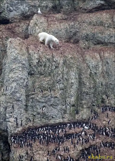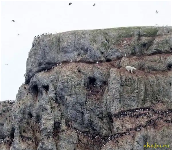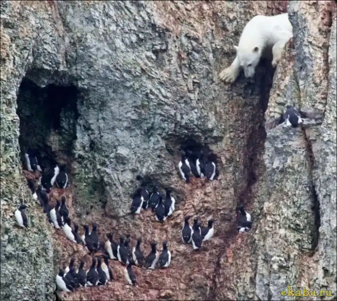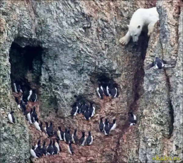 Белый медведь решил полакомиться птичьими яйцами, а высокое расположение добычи не стало для него преградой.