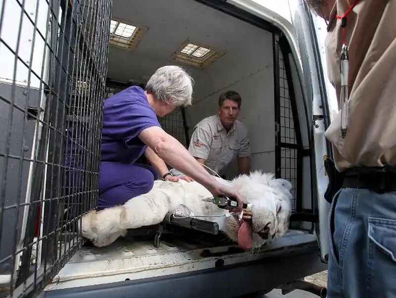Четыре смотрителя перенесли льва на носилках в ожидавший автомобиль, чтобы он отправил царя зверей к местному стоматологу.