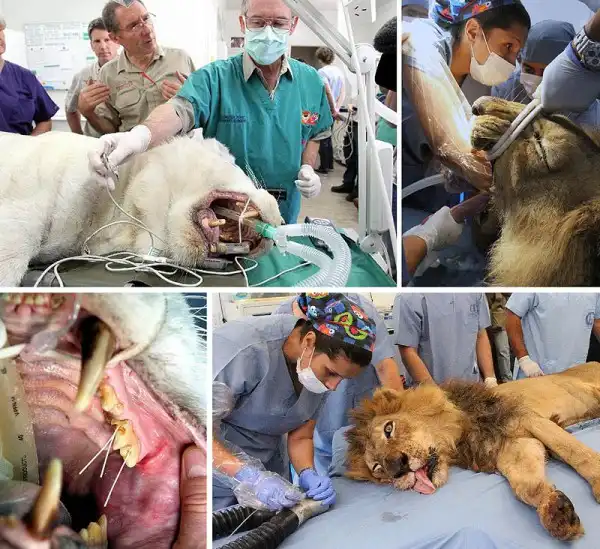 Многие люди боятся ходить к стоматологу. А вы бы попробовали посадить в стоматологическое кресло 190-килограммового бенгальского тигра или 20-летнего царя зверей?